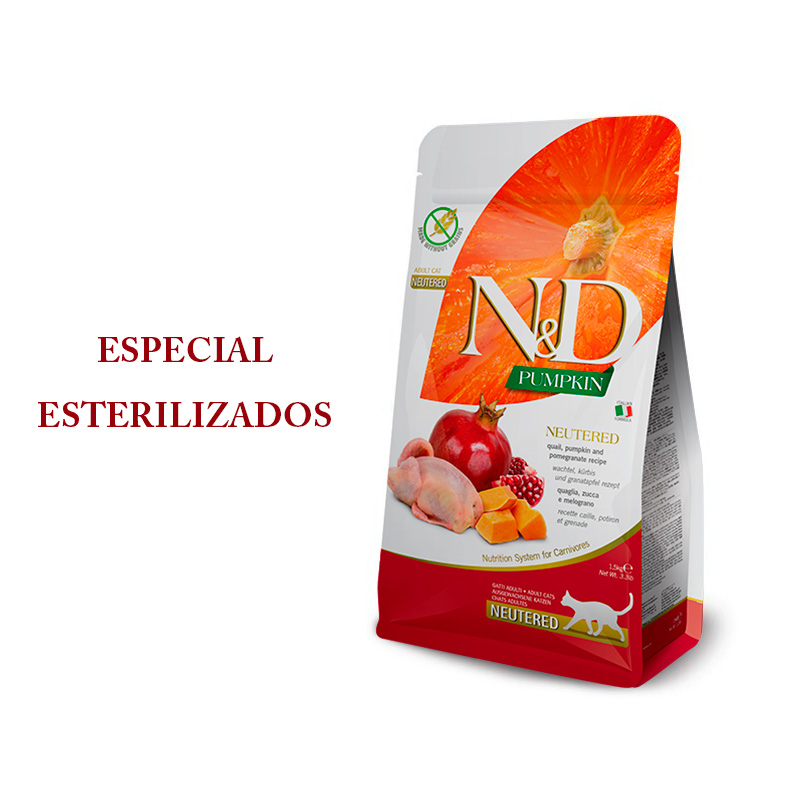Farmina N&D Pumpkin Feline Codorniz, calabaza y granada Neutered es un alimento completo para gatos adultos esterilizados, desarrollado para adaptarse a los cambios metabólicos que se producen tras la castración. Su receta mantiene un alto contenido de proteína de origen animal, con codorniz como ingrediente principal, y está formulada sin cereales.