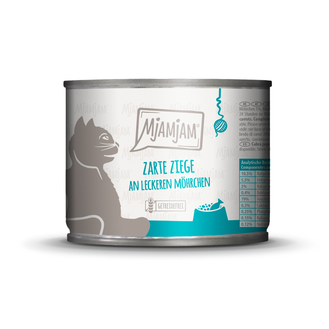 Esta lata de MjAMjAM para gatos es un alimento completo elaborado con cabra como única fuente de proteína animal, acompañado de zanahorias y minerales. Su formulación está pensada para ofrecer una alimentación húmeda de composición clara, con un perfil adaptado a las necesidades del gato adulto.