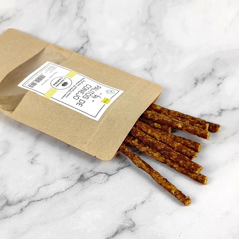 Estos palitos tiernos están elaborados con carne de conejo secada al aire, un proceso natural que ayuda a conservar el sabor y las propiedades del ingrediente principal sin necesidad de formulaciones complejas. Su consistencia blanda permite ofrecerlos fácilmente como premio ocasional o durante el adiestramiento.