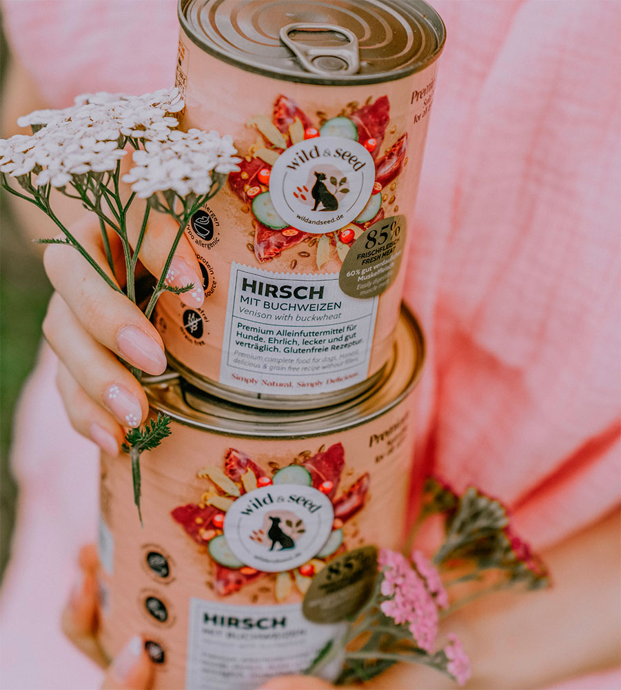 Ingredientes: 85 % ciervo (60 % carne muscular, 21 % pulmón, 4 % cuellos), 5 % calabacín, 4 % trigo sarraceno, 3 % semillas de lino, 1 % arándanos, 1 % minerales.